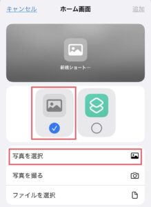 後は開いた画面で左側の写真アイコンにチェックを入れ、下の『写真を選択』からアプリ(ブックマーク)に使いたい画像を選択します。
