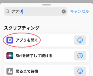 スクリプティングからアプリを開くをタップします。※ブックマークならブックマークを開くを選択 あとは共通の操作です。 ・アプリ(ブックマーク)の部分をタップして、アイコンを変えたいものを選択します。